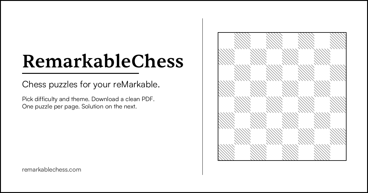 We fetch puzzles from the Lichess open database, render each position as a clean black-and-white board, and assemble a PDF ready to load onto your device.
